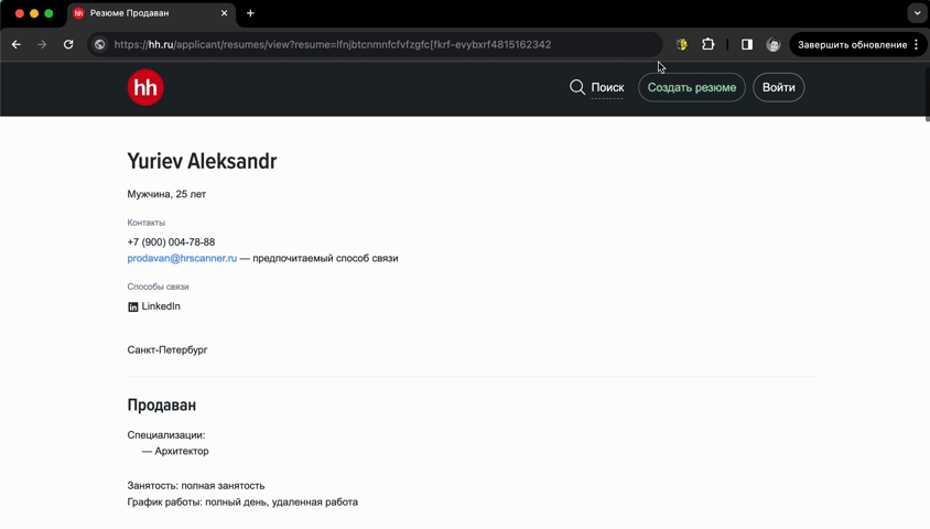 Виджет HRSCANNER открыт на сайте hh.ru. Любые тесты можно отправить прямо со страницы кандидата.